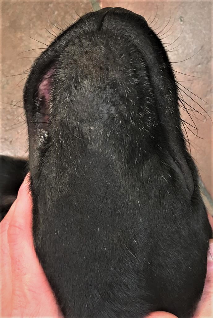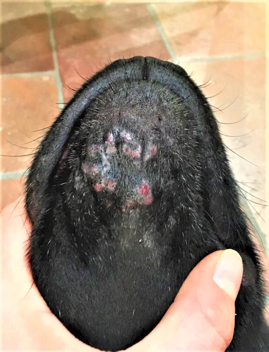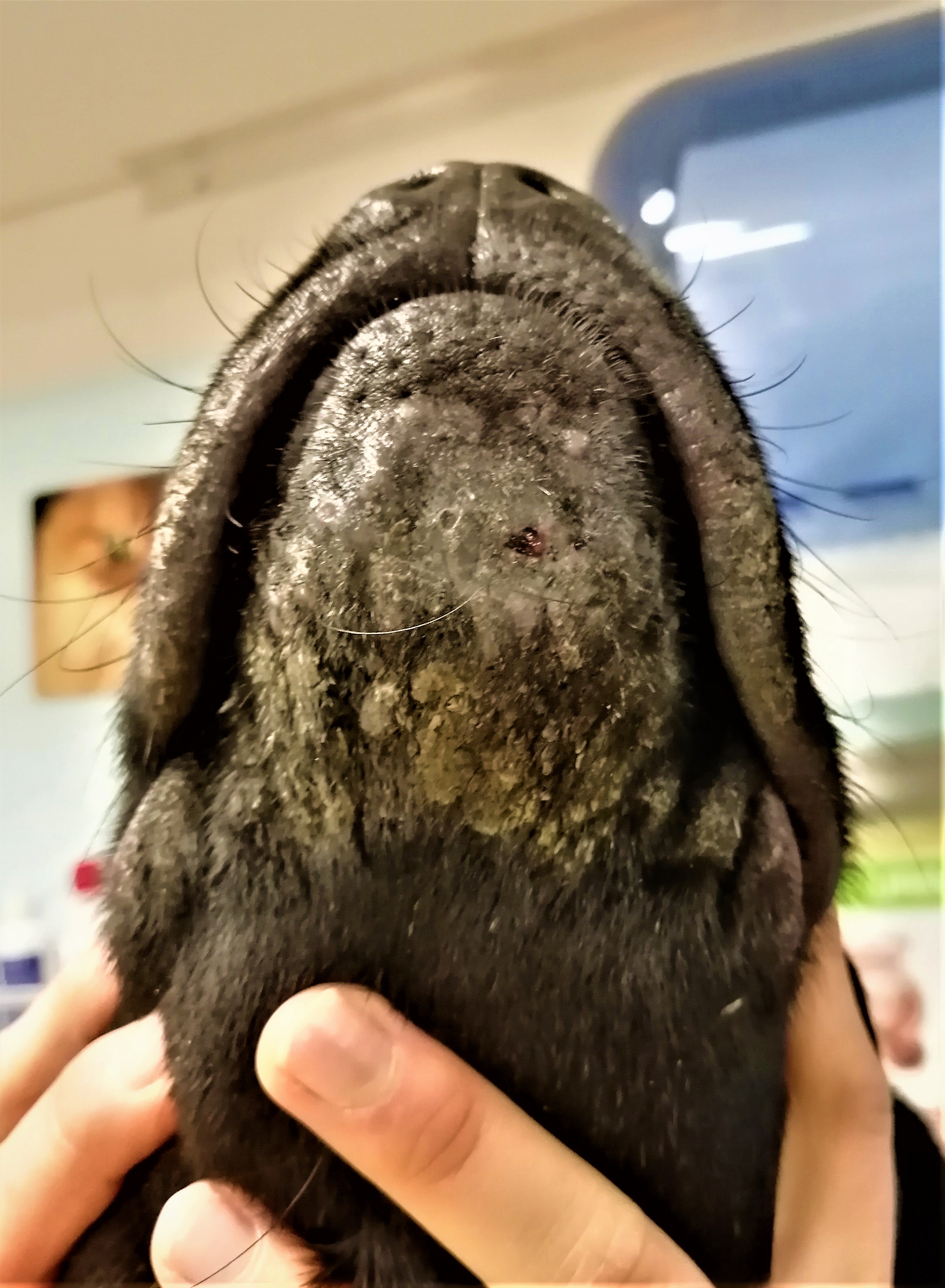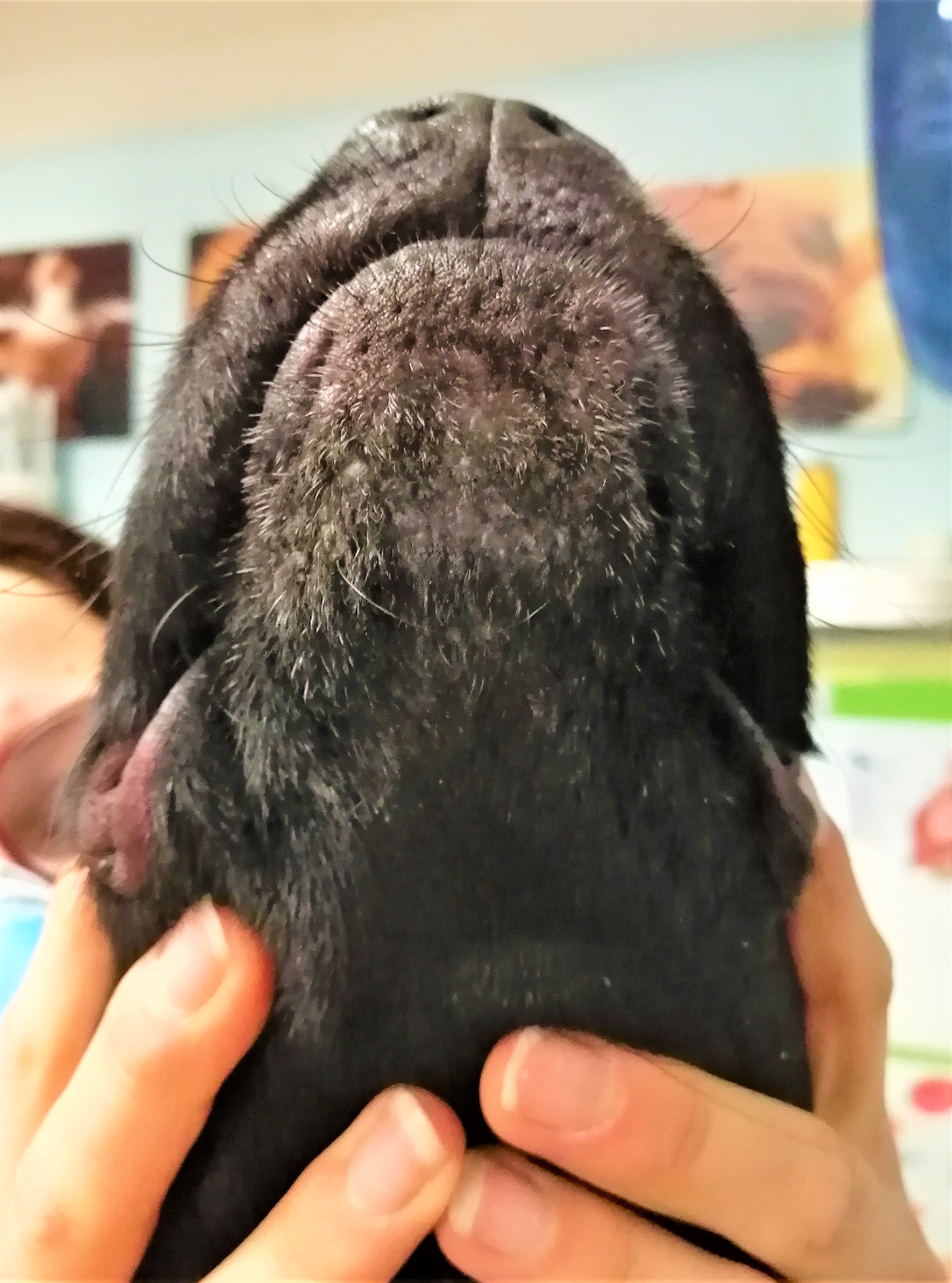Moka è una giovane labrador retriever molto vivace che, da diverso tempo, presenta delle papule rilevate sotto al mento. Queste papule/foruncoli si presentavano in numero di 2 o 3 per volta, senza una correlazione stagionale o alimentare. La maggior parte delle volte guarivano spontaneamente, altre volte si ulceravano e sanguinavano. Nell’ultimo periodo, la situazione si era aggravata: erano apparsi foruncoli su tutto il mento, contenenti materiale siero emorragico, associati a una dermatite desquamativa localizzata sempre sul mento. Moka non è assolutamente infastidita dalla situazione.