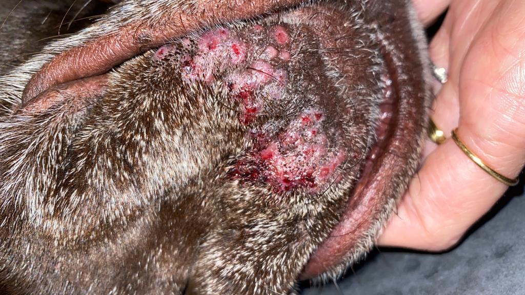 Durante questi ultimi 4 anni il cane ha continuato ad avere problemi cutanei con miglioramenti altalenanti e sono state impostate terapie più o meno simili variando il principio attivo dei prodotti usati. Dal 2018 al 2022 si sono susseguiti tutta una serie di esami di approfondimento, non risolutivi (test allergologici, batteriologici, visite nutrizionali), finchè a maggio 2022 la signora si imbatte nella nostra pagina web e ci contatta.