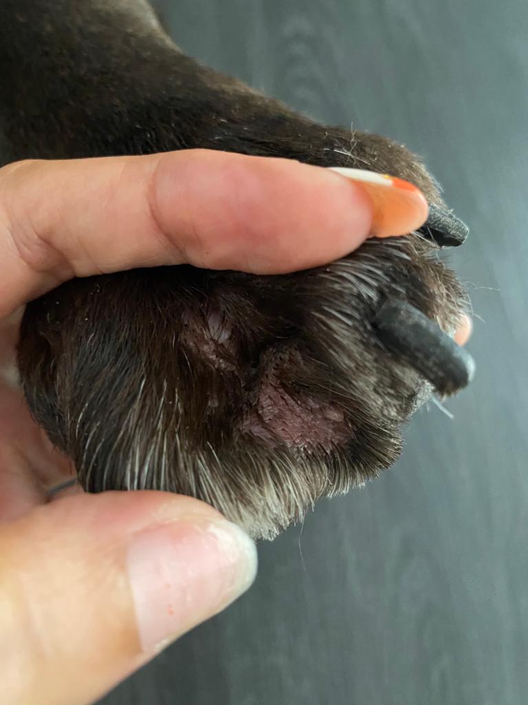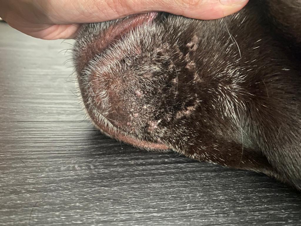 Jack è un cane, un bellissimo labrador color chioccolate di 5 anni che fin dal primo anno di età ha iniziato a manifestare segni dermatologici quali otite bilaterale, dermatite umida sulle guance, acne del mento e prurito con leccamento delle zampe. La proprietaria ci descrive inoltre la presenza di noduli tra le dita delle sole zampe anteriori e sovra infezione con fistole sulle zone di appoggio quali mento, gomiti e tarsi, anche se questi ultimi in forma più lieve rispetto agli arti anteriori. Jack riceve correttamente la profilassi antiparassitaria, convive con dei gatti, vive in casa e giardino.