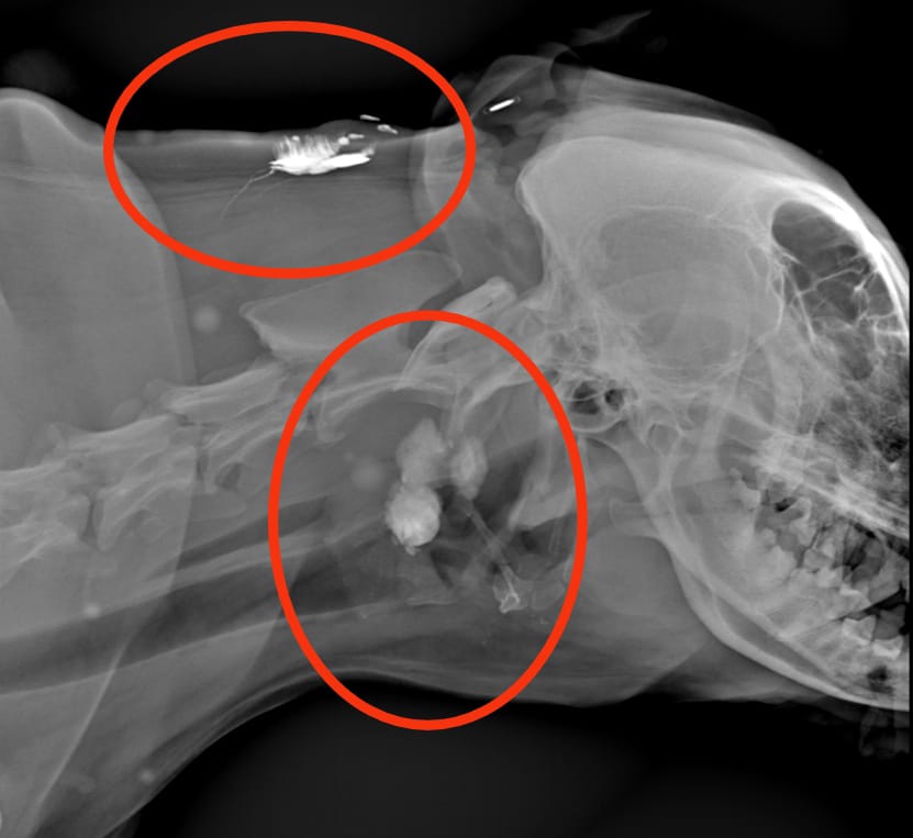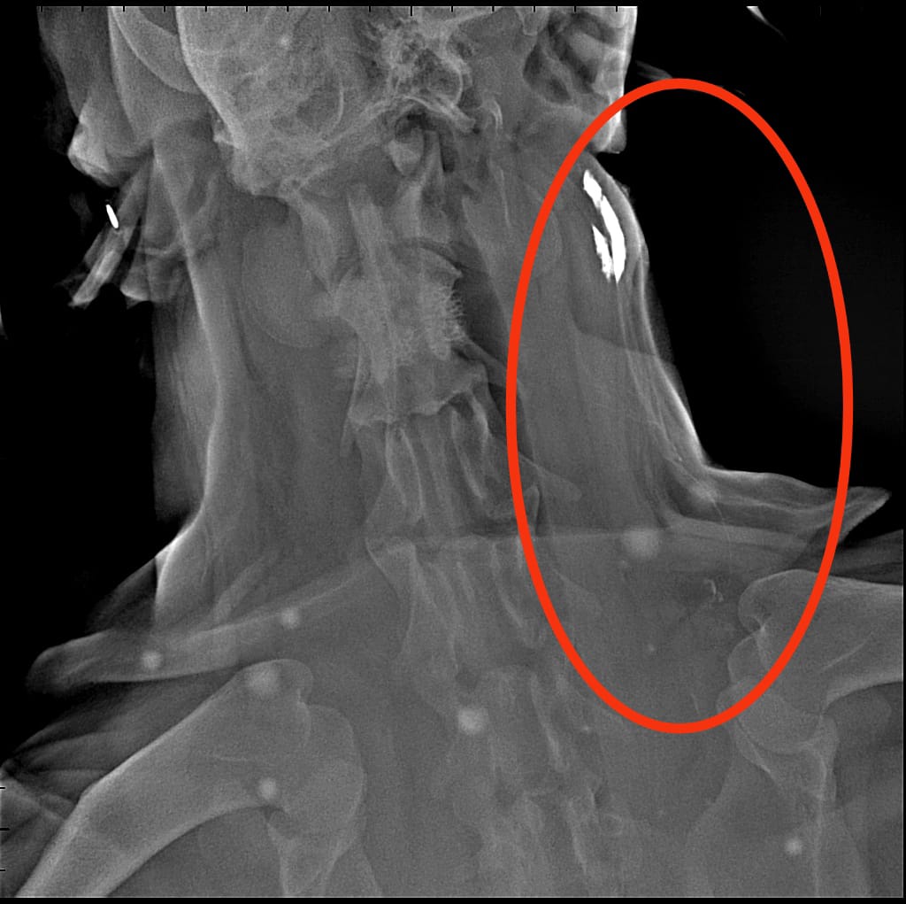 Il linfonodo regionale, ovvero il linfonodo che drena la linfa di quella determinata regione corporea, viene ricercato tramite l’inoculo perilesionale di una sostanza visibile all’esame radiografico (radiopaco). Dopo aver iniettato il mezzo di contrasto, sono state eseguite delle radiografie dopo 3, 6, 9 e 12 minuti: da queste è stato possibile osservare diversi “percorsi” del mezzo di contrasto che si portavano verso il linfonodo prescapolare.